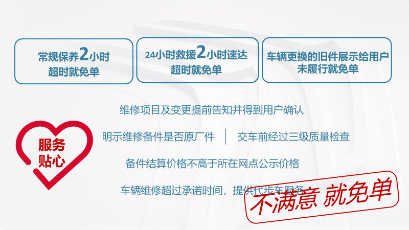 行业内首创 “不满意、就免单”,8项服务承诺全新升级。如常规保养2小时内完成,超时免单;全国范围救援两小时必达,超时就免单;车辆更换旧件,展示给用户,未履行就免单。