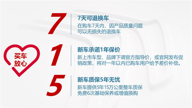 “1”就是 “新车承诺1年保价”,经常有用户吐槽新车一出来很快就降价,这项政策承诺,新上市车型1年内,如果品牌下调官方指导价,或者官网促销导致指导价下调,都将给予用户差价补偿;