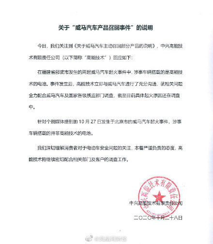 中兴高能技术表示,在福建省邵武市发生的两起威马汽车起火事件中,涉事车辆搭载的是高能技术的电池,事件发生后高能技术立即与威马汽车进行了充分沟通,并就相关问题全力配合威马汽车及国家各级质监部门调查,截至目前具体起火原因还在调查中。
