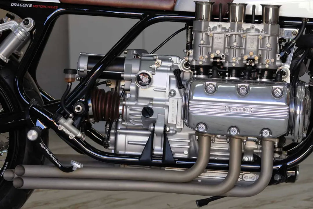 要实现这个天马行空的创意,是一项工程量很大,难度很高的工作。先是将原车四缸发动机拆下,换成本田瓦尔基利的1500cc水平对置六缸发动机。这里补充一下,本田瓦尔基利是一台颇具硬汉风格的重型巡航车,因其裸露的六缸发动机,国内摩友都亲切地叫它 “大排骨”。