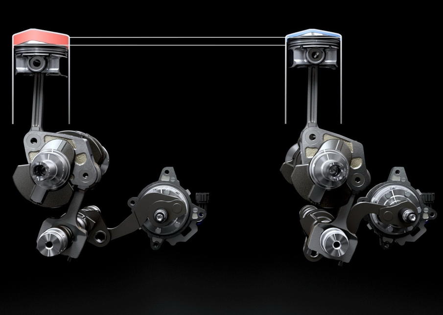 正是这套多连杆机构的角度变化,才得以调整活塞的上止点停止位置,由此改变气缸内部压缩比。具体来说,控制轴在低位的时候,连杆推动曲轴旋转,使活塞到达高位,由此实现14:1高压缩比;反之,则实现8:1低压缩比。
