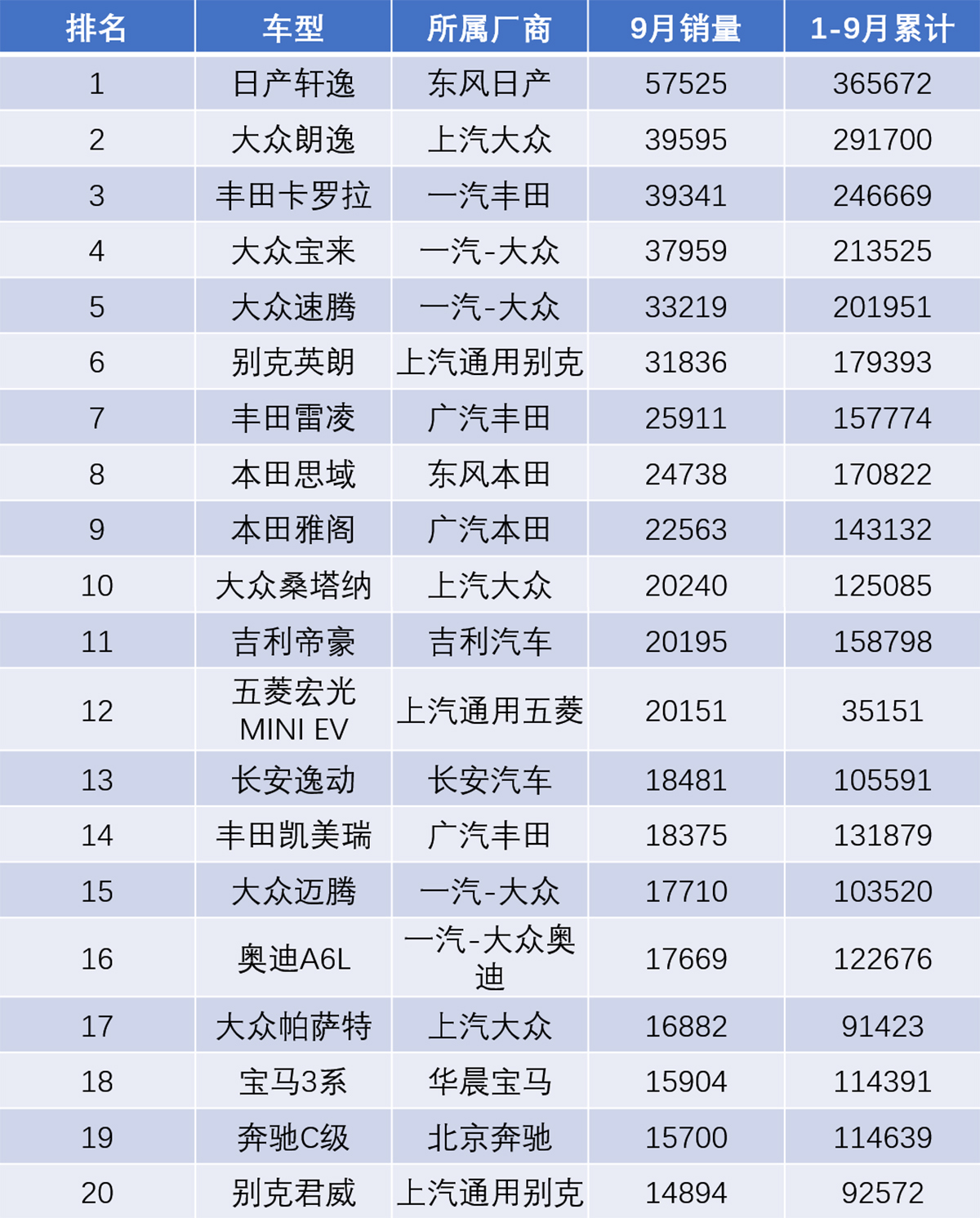 首先从轿车销量榜中可以看到绝大部依然是我们熟悉的车型,轩逸 (配置|询价)、朗逸、卡罗拉依然是雷打不动的TOP3,紧凑型的轿车依然是那么受欢迎,1来万的预算,这些就是标杆。当然也有陌生的车型,比如五菱宏光MINI EV在9月的销量突破了两万台,国产电动车的春天终于来了吗?