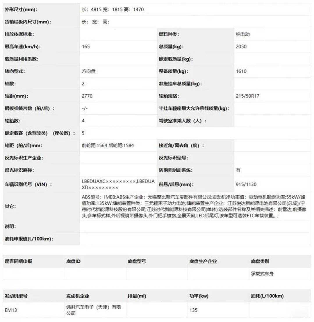 在早先一批的新车申报目录中,新车曾进行了申报。在外观上,除了有着纯电动车型明显特征的封闭式中网外,新车还采用了分体式的前大灯组。