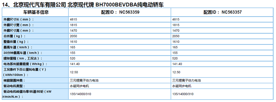 日前,我们从国家工信部最新公布的第三十六批免征车辆购置税的新能源汽车车型目录中,获取到了北京现代名图纯电动车型续航及电池容量的相关信息。