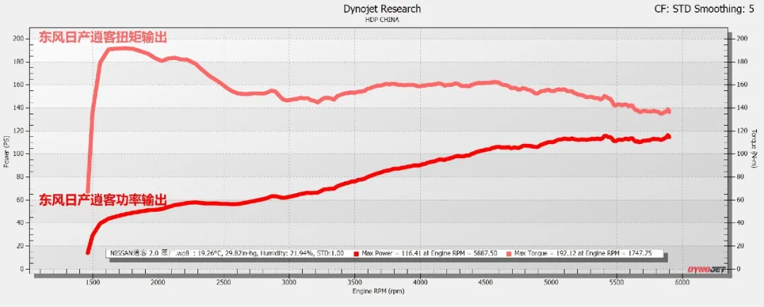 东风日产逍客在启动加速之后,随着转速的攀升,扭矩爆发来的十分突然,至1748rpm时,扭矩数值来到最高点的192牛·米,随后不断下滑,同时在2500rpm-3500rpm之间有着明显的波动,输出力度在衰减后再次拉升。功率输出部分,随着发动机转速的攀升,发动机功率保持持续上升,至5887rpm时,功率数值为116.4kW。