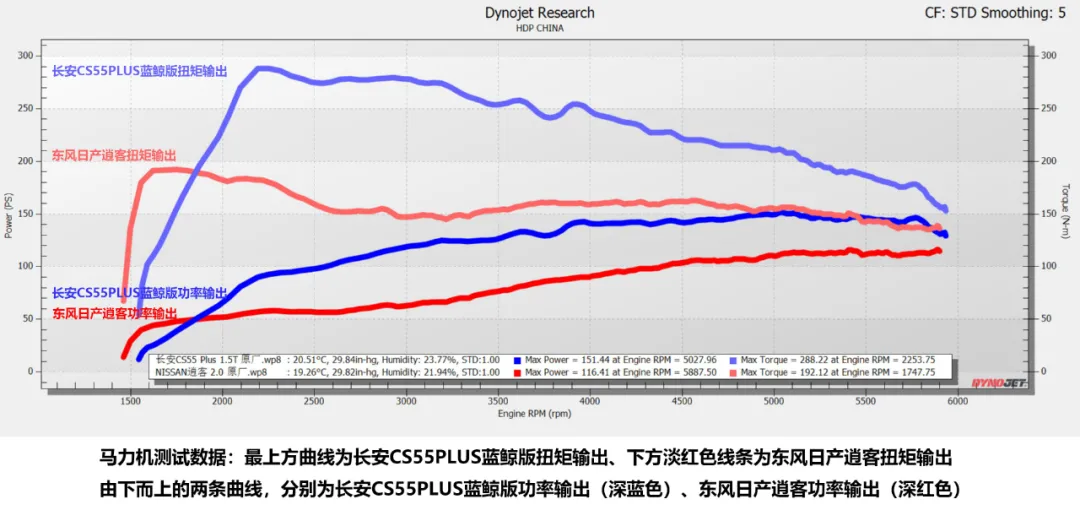 解读上述数值:在我们特定的测试工况之下,长安CS55PLUS蓝鲸版的动力输出明显优于东风日产逍客的表现。
