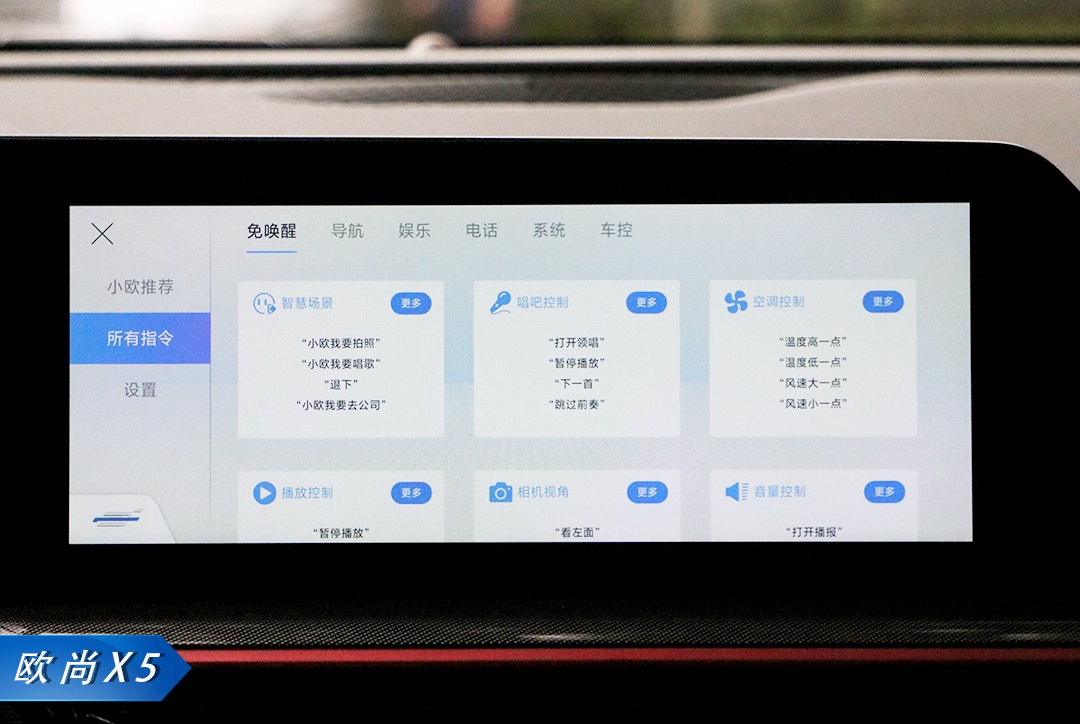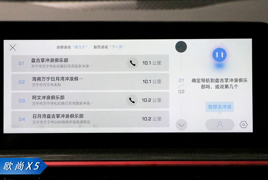 区别于以往车型搭载的语音识别系统,“小欧”能够识别更多场景化应用,例如说一句“我想去冲浪”,系统会立即调出周边冲浪俱乐部的位置,根据用户选择开始导航。传统的语音识别功能需要我们按照固定话术沟通,会显得特别生涩,体验感非常弱,而笔者与“小欧”对话时,就像与真人沟通一样,很随意,而且可以随时打断它的发声。此外,通过“小欧”共可以实现65项智能车控功能,这样的水平不仅是同级前列,在10-15万级主流SUV中也不多见。