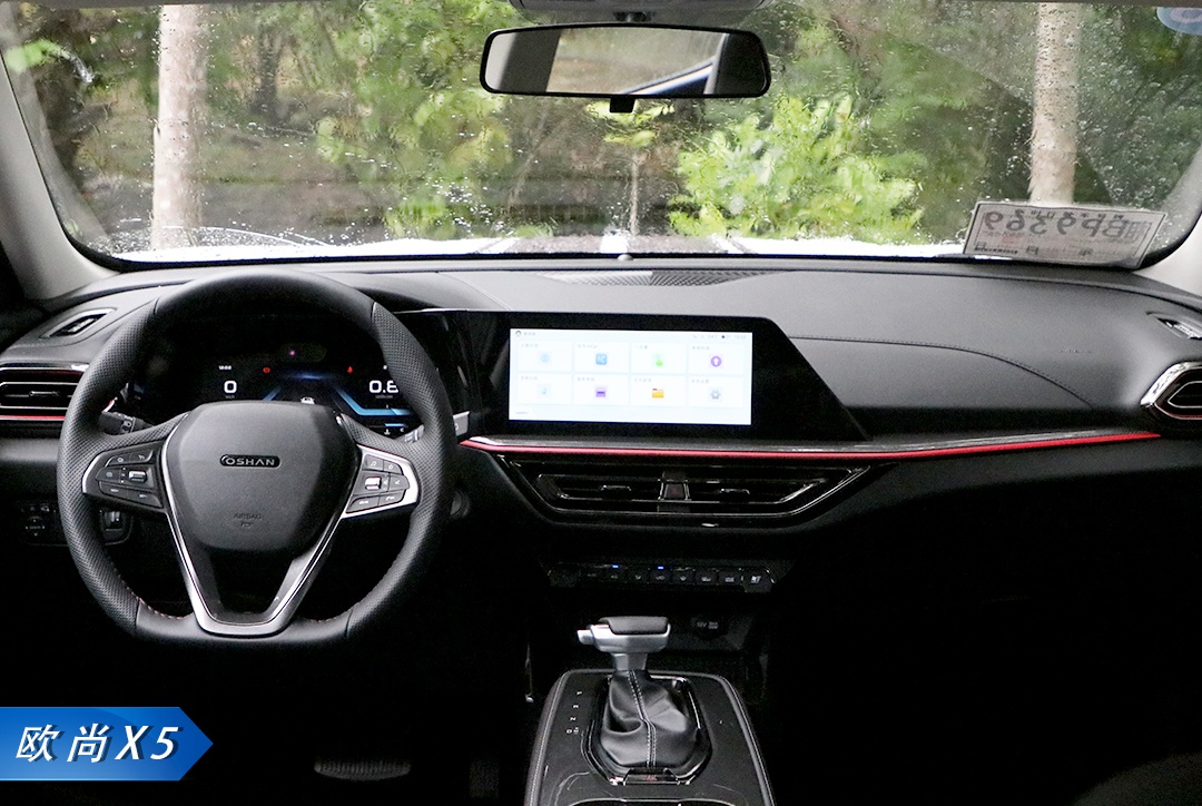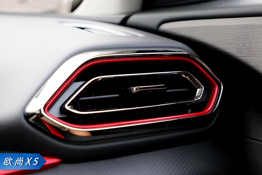 将视线转移至车内,欧尚X5的颜值表现依旧使人充满新鲜感。作为一款定位年轻化的产品,其内饰以黑色为基调,并在细节上点缀了大量红色细节,例如饰板上的红色拉花、方向盘缝线、空调出风口包边等。红黑撞色的设计,使内饰的运动氛围得以体现。内饰部分除采用大量皮革包裹以外,还设置了许多软质材料,加之碳纤维纹路装饰,使触感和观感得到了双重提升。更重要的是,带有人脸识别的AI摄像头位于全液晶显示屏上方,搭配10.25英寸中控大屏设计,一眼就能感受到智能座舱的浓厚氛围。