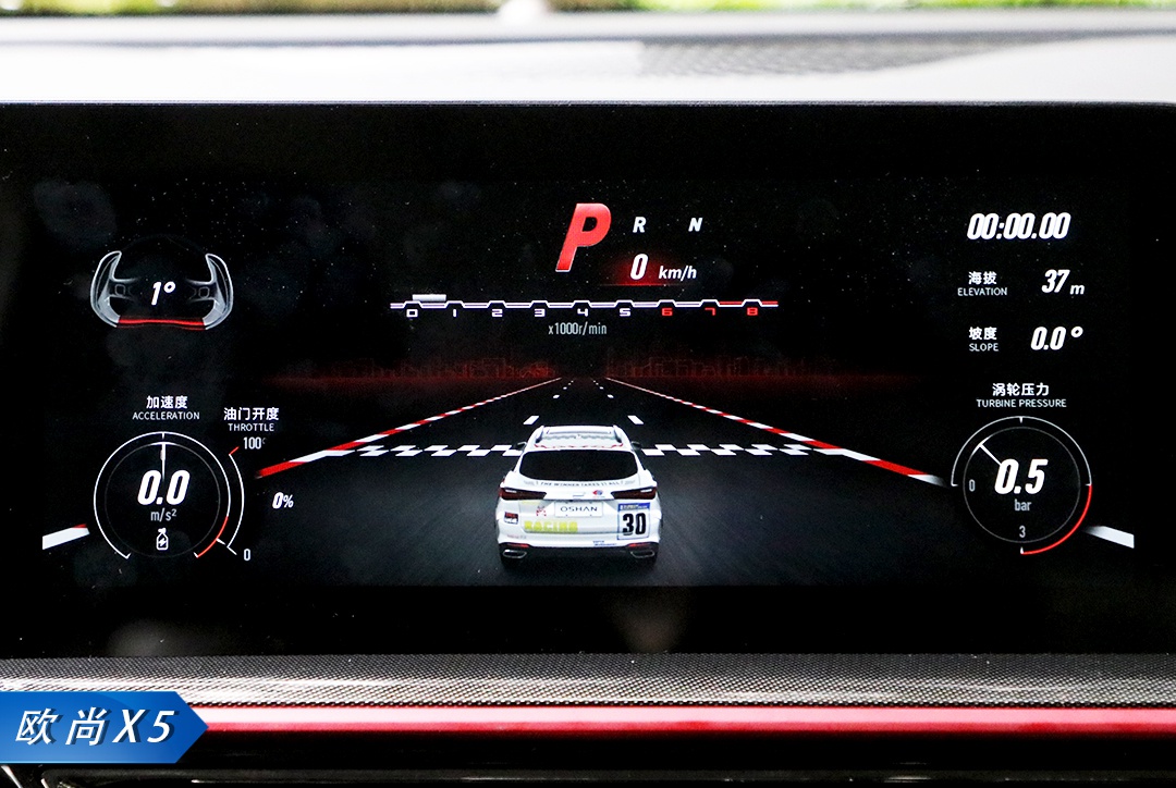 值得一提的是,在赛道模式下欧尚X5的动力输出更加激进,然而车内的模拟声浪和中控动画,会令人产生置身游戏厅开赛车的错觉。笔者认为,赛道模式在设计之初,自然是为了满足年轻人对赛车运动的喜爱,不过,这种模拟场景更多是满足年轻人的猎奇心,实际使用场景并不多,运动模式就能满足多数情况下的性能需求。