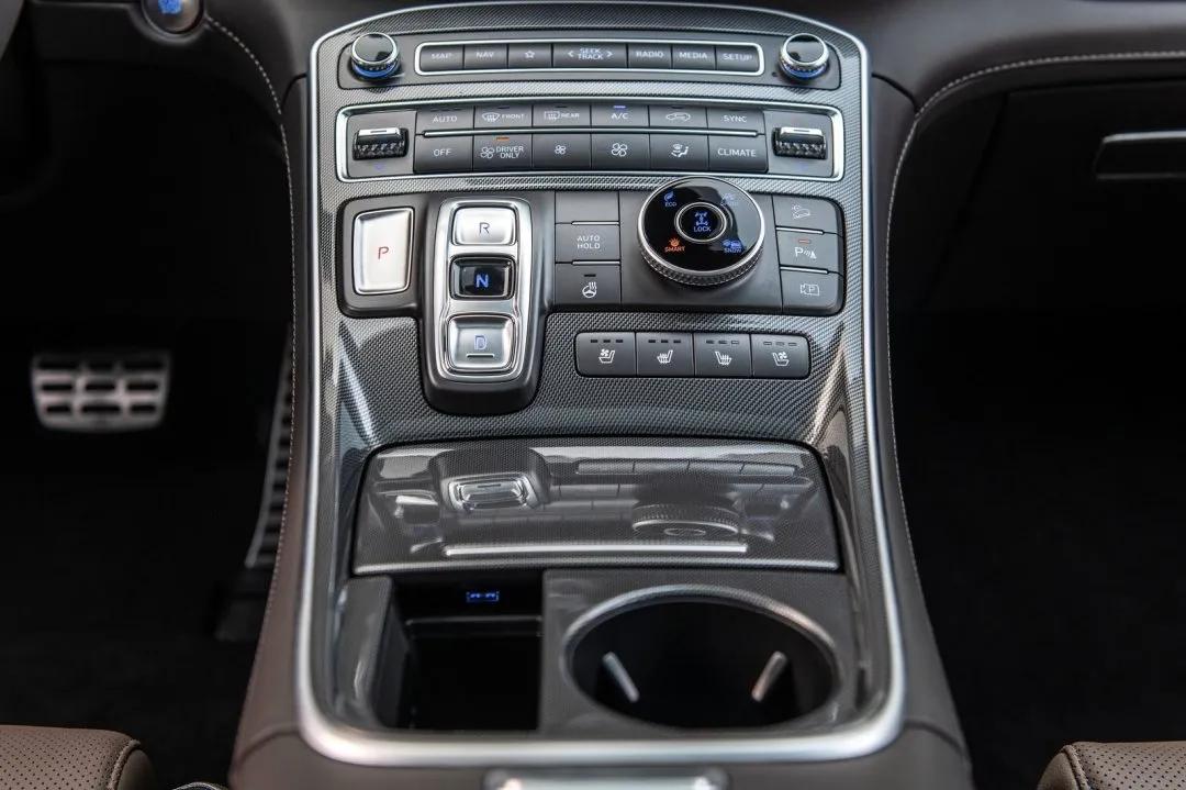 来到车内,中控台上半部分的设计其实和现款车型保持一致,但换挡杆周围却进行了新的设计。如果之前现代帕里斯帝你有留意的话,那大概可以看出新款胜达这一部分的设计是与帕里斯帝同源的,抬高了的中控台操作区更方面在行进过程中操作,并且在全面采用电子按钮换挡后在中控台底下还掏出一整块空间来做储物格。无论是看起来的档次感还是实用性都有了进一步的提升。