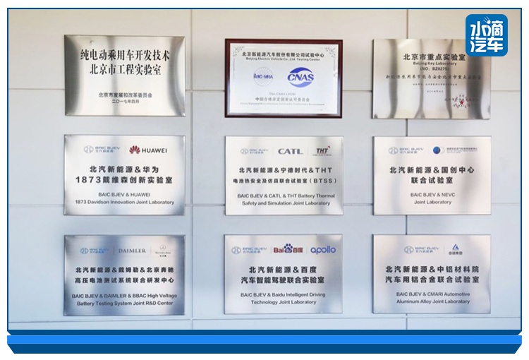 然而,要想不让用户充当“小白鼠”,BEIJING汽车的试验中心就显得尤为重要。从蓝谷大厦里,穿过一个玻璃走廊便可来到诺基亚老工厂腾笼换鸟后的试验中心。在试验中心门口墙上,可以清晰的看到BEIJING汽车的联合合作伙伴,包括戴姆勒奔驰、宁德时代、国创中心等14家知名中外汽车研究单位。