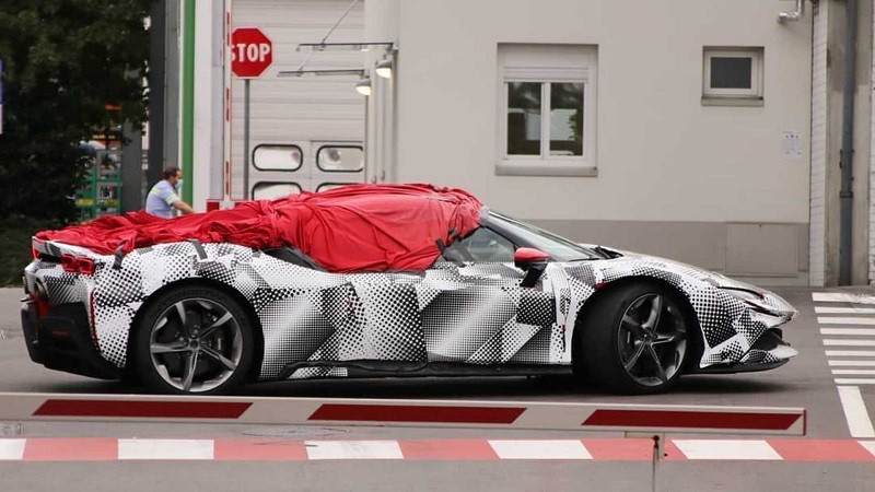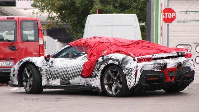 外观方面,从此次曝光的谍照来看,新车仍覆盖着厚重的伪装,其中车顶还覆盖着一块红布,有极大的可能是在伪装新车的敞篷车顶结构。车身其他部分设计与法拉利SF90 Stradale硬顶版如出一辙。其中前脸方面,新车造型十分低矮,前保险杠采用呈两段式布局的大尺寸进气口设计,搭配上C字形的前大灯组使得新车视觉上攻击力十足。