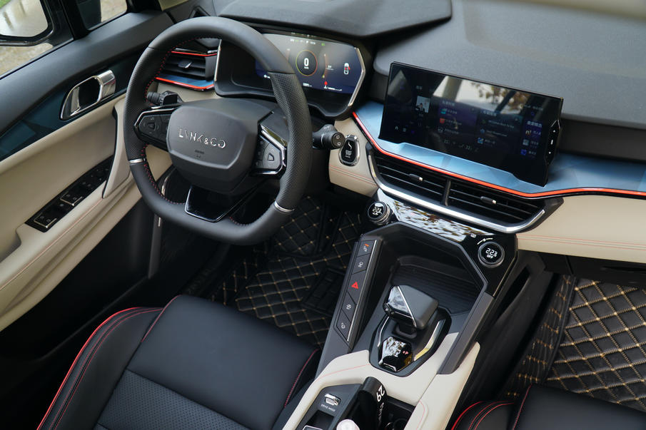 进入车内第一眼就会被它悬浮式的中控屏吸引住目光,挡杆区域的按键也有了全新的布局,与领克车系之前使用的内饰设计方案相比明显年轻不少。