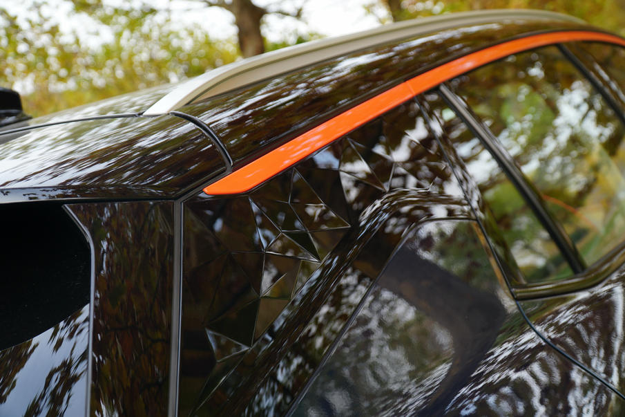 当然车辆C柱也不是简单熏黑营造悬浮式车顶,而是采用“棱面机甲”设计元素,其表面材质集成了立体的几何形状,在光线折射下会出现渐变式效果,这就是领克06的“机能主义美学”元素之一,也是细节上精致的体现。