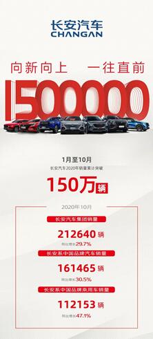 11月5日,长安汽车率先对外公布了企业10月销售数据。根据数据显示,10月长安汽车以同比增长29.7%、销售212640辆的表现,再度迎来今年单月销量新高。随着企业销量持续攀升,长安汽车1——10月已交出了累计销售1583521辆,同比增长14.1%的亮眼成绩,企业2020年销量提前两个月突破150万辆大关!