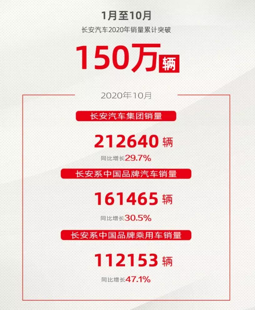 据官方今日发布的公告显示,长安汽车集团(含长安系中国品牌、长安福特、长安马自达)10月销量达21.26万辆,同比增长29.7%,累计销量更是已经突破150万辆。其中,长安系中国品牌(含长安汽车、长安欧尚汽车、长安凯程)10月销量16.15万辆,同比增长30.5%。