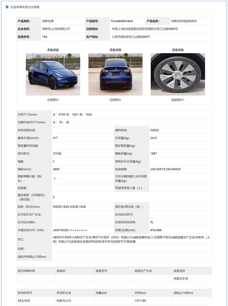 在最新公布的一批新车申报信息中,我们获取到了有关于国产特斯拉Model Y车型的相关信息。