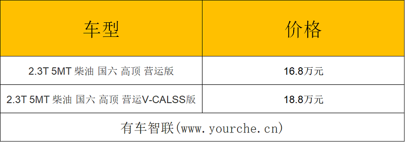 动力方面,新车搭载2.3T柴油发动机,最大功率为120马力,最大扭矩为320牛·米,并满足国六排放标准。传动系统方面匹配的是5速手动变速箱与后轮驱动。