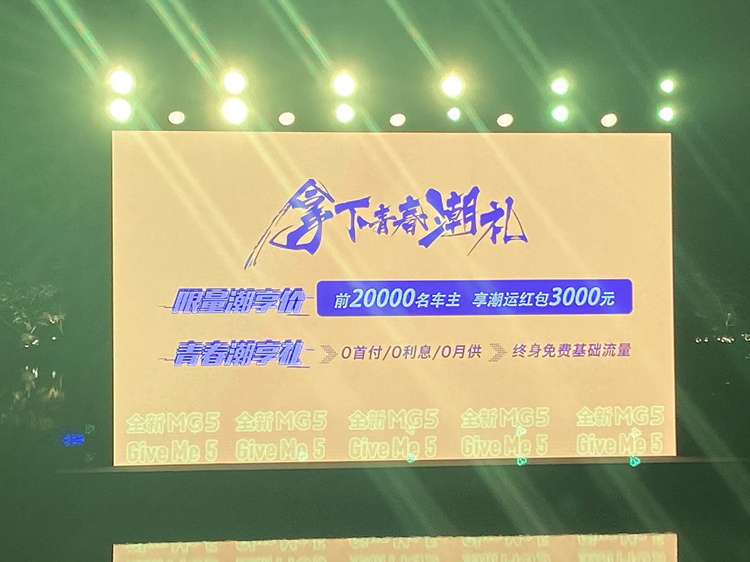 11月8日晚,全新MG5 (配置|询价)正式上市。新车共推出7款车型,售价区间为6.79万-9.99万元。与此同时,官方还推出了前2万名车主享3000元红包的限量潮享礼,0首付、0利率、0月供以及终身免费基础流量的青春潮享礼。另外,从现场获悉,全新MG5超越版车型将于2020广州车展推出。