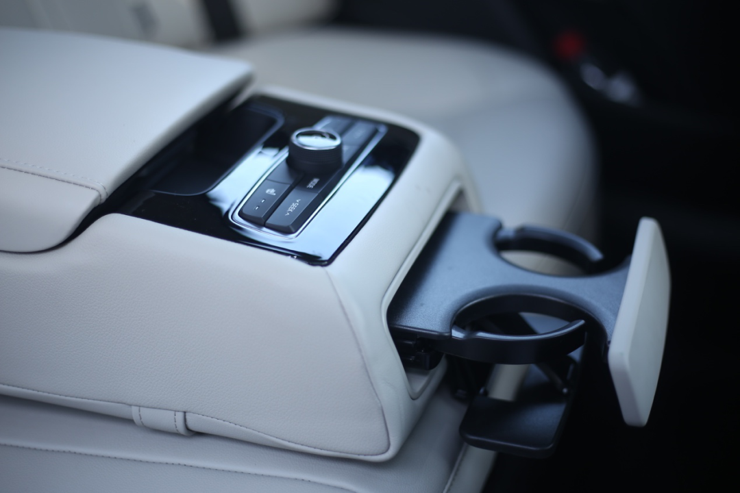 其他的细节包括全景天窗、后排多功能扶手、副驾老板键、后排头枕、后排出风口,都是可圈可点,无线充电、座椅方向盘加热、一键启动等应该有的配置也是一样都没有少。连音响也是带有7个扬声器的JBL豪华音响。后排如果只坐两人的话头部和腿部空间都很充裕。唯一我不满意的两点,一是手套箱内没有植绒,放东西可能会响;另外一个就是副驾裸露的氛围灯带,虽然可选颜色够多,但始终感觉没有隐藏式的高级。