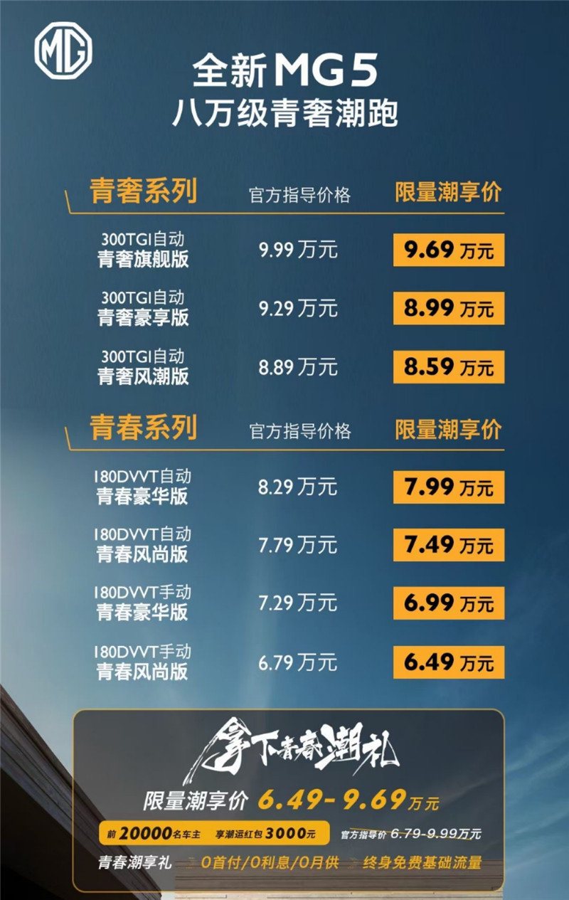 今夜,杭州西子湖畔,全新MG5 (配置|询价)正式上市,售价区间6.79万-9.99万元,官方价格之外,前两万名车主还能享受立减3000元的购车优惠。