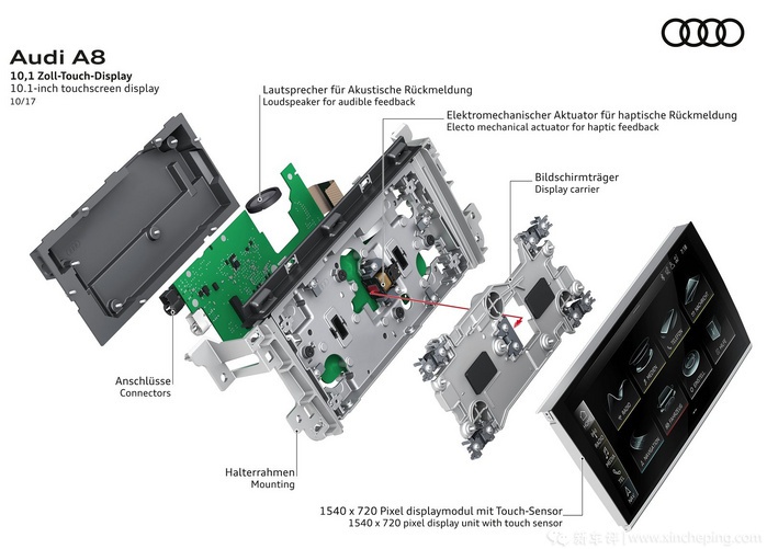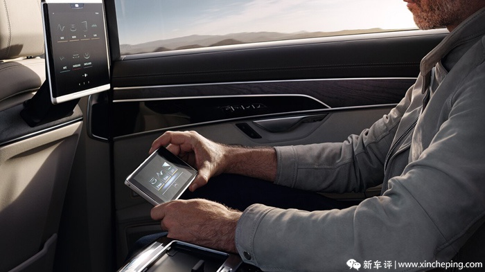 像还是回归到屏幕方面,除了刚才所提到的、作为最新一代MMI系统核心亮点之一的这两块中控触屏外,A8L车上还提供包括虚拟座舱(液晶仪表)、正/副驾驶座后排触控平板及位于中央扶手上的后排中控屏等另外4块屏幕,全车合共达到6块显示屏,其中5块都支持触控操作,并可以实现不同屏幕之间信息(如导航目的地等)的交互/投送。