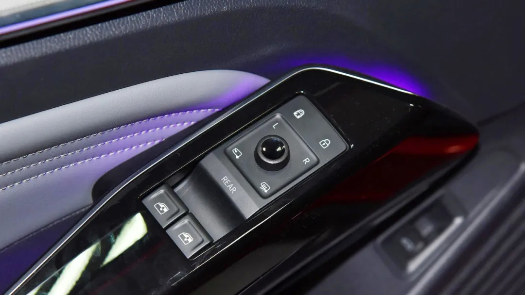 更有意思的是,ID.4的主驾驶门板上的车窗控制按键只有两个,在默认状态下只能调整前排车窗,如果驾驶员想要调整后排车窗的话,需要先按一下“REAR”按键,然后才能通过这仅有的两个按键调整后排车窗的开闭。