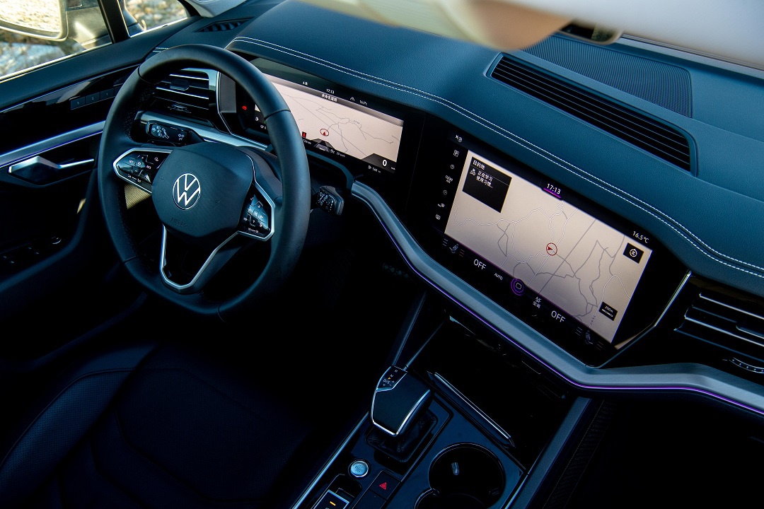 途锐eHybrid的内饰依然是大众最新的家族式设计,其中中控台向驾驶员一侧略微倾斜,再搭配上全新造型的三辐平底式多功能方向盘,体现出它注重驾驶的属性。作为旗舰SUV车型途锐eHybrid在豪华感上丝毫不落下风,无论是中控台上大面积的软质材料和细密的缝线,还是车门内板上包裹的真皮材质,以及环绕内饰的银色拉丝饰条,都很好的体现出它的品牌旗舰定位。