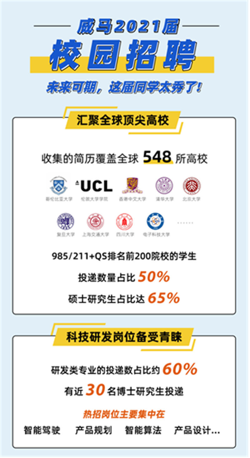 截止目前,威马汽车共收到覆盖全球548所高校应届毕业生的简历,985/211+QS TOP200院校的学生投递数量占比超50%,主要来自哥伦比亚大学、香港中文大学等世界顶级名校,以及清华大学,北京大学,复旦大学,上海交通大学、电子科技大学,四川大学等国内顶尖高校。其中,研发类专业的投递数占比约60%,热招岗位主要集中在智能驾驶、产品规划、智能算法、产品设计等。