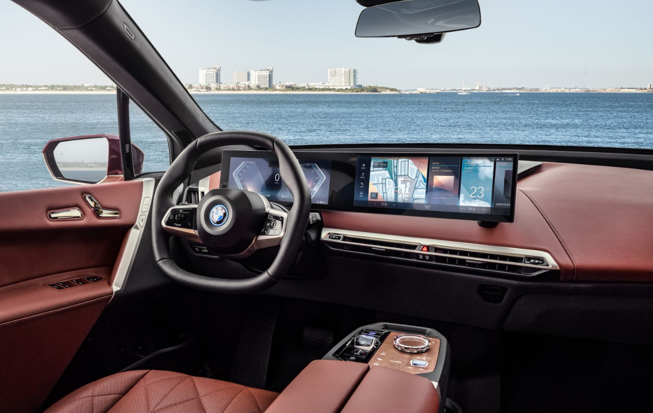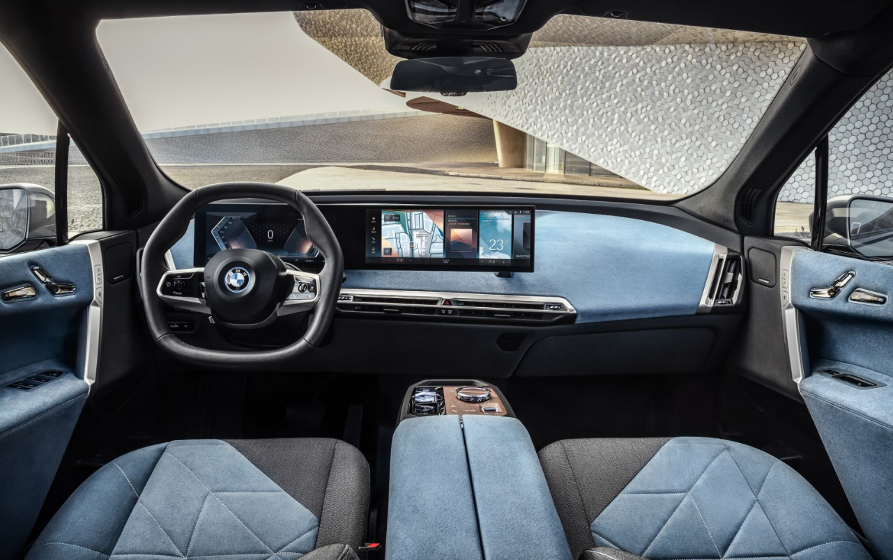 内饰方面,采用以人为本的理念,通过宽敞的空间、智能材质的搭配组合、带有一体式头枕的创新座椅以及超大全景玻璃天窗营造出一个奢华、惬意的BMW iX座舱。六边形方向盘的独特造型汲取了赛车方向盘的设计灵感,增强了曲面大屏的可视效果。车内按钮数量减少了约50%,位于中控台的超大一体式曲面屏简洁而直观,优化信息显示方式的同时,还可以通过语音、触控等更直接的方式进行操作,实现人与车之间更加友好的互动。