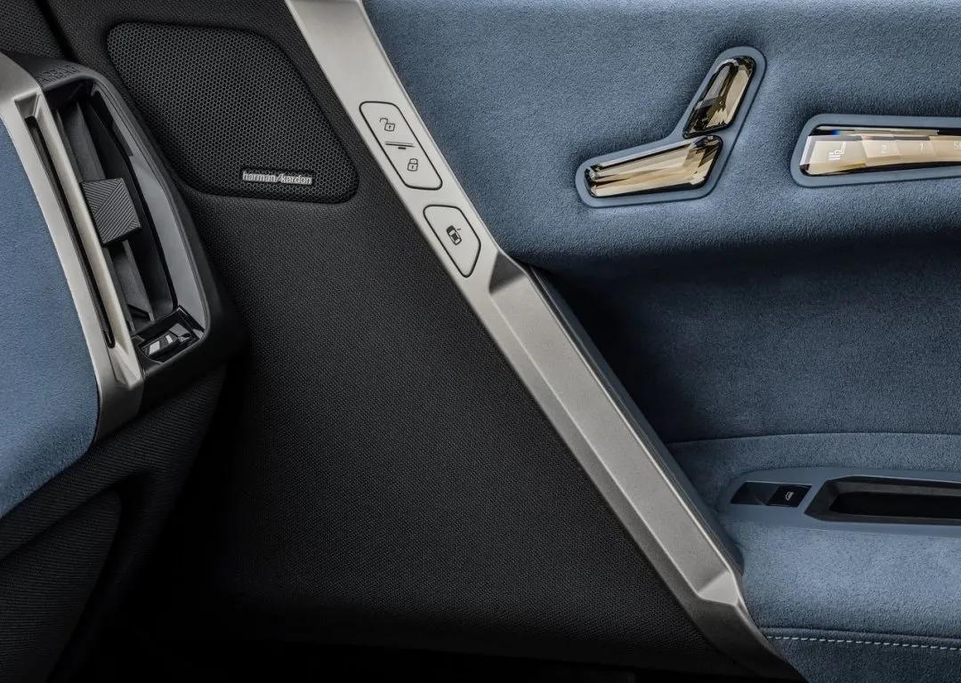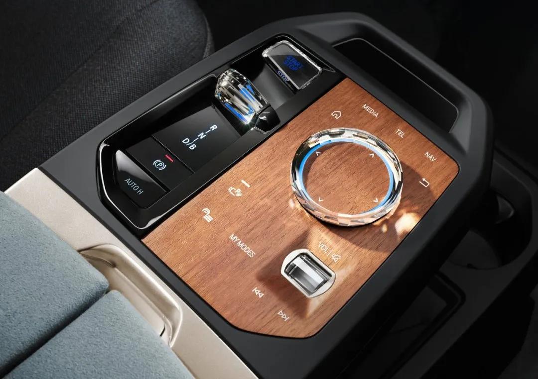 内饰是颠覆性的,整体布局和现款宝马做了明显区分——两辐式方向盘、一体式大联屏等。蓝灰配色很显档次,也很有新能源车的味道,在空调出风口、头枕等处还加入了金色点缀。另外,iX在挡杆、按钮、旋钮等细节使用了水晶装饰,特别闪耀。