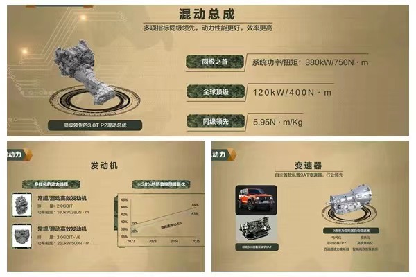 动力部分,坦克平台涵盖ICE、PHEV、HEV三种动力形式。常规发动机有38%的热效率,作为旗舰担当的P2混动总成为3.0T发动机+纵置9AT变速箱,系统总功率380kW和峰值扭矩750N·m,账上数据相当亮眼。最新上市的坦克300车型的传动系统将匹配采埃孚8AT变速箱。