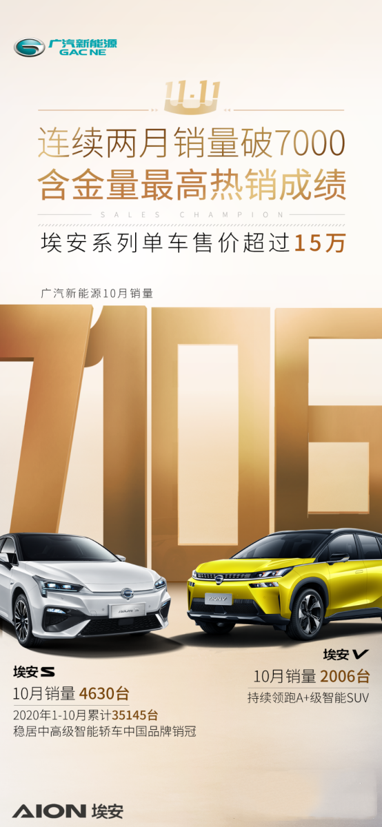 今年1-10月,广汽新能源累计销量超4.5万辆,同比增长72%。其中埃安S销量达4630辆,继续蝉联中高级智能轿车中国品牌月销冠军;埃安V在A级智能SUV市场持续保持热销,连续三月销量超2000辆。“一门双冠”的强势表现正是广汽新能源坚持以用户为中心,打造世界级产品和服务的最佳回报。随着第四款全新车型的到来,埃安家族的产品矩阵将进一步丰富,成为更多消费者“更聪明的陪伴”。