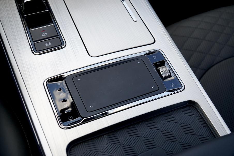 挡把后方是中控系统的实体控制面板,左侧集成了返回、地图、影音、关闭四项功能的快捷键,中央触控面板区域可实现调节音量、控制地区缩放等功能。