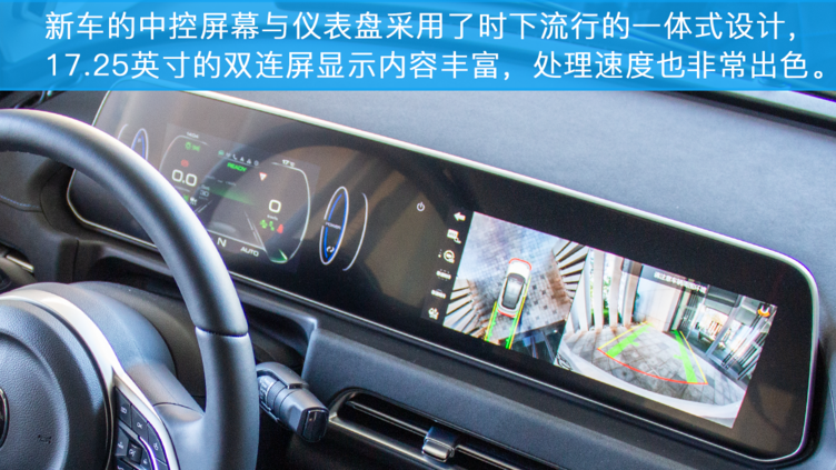 17.25英寸的双连屏十分吸引眼球,可通过触摸、语音、物理按键和多功能方向盘进行控制和交互,实现仪表信息、车辆状态信息、自动驾驶信息与多媒体娱乐信息等内容的显示。在高通专业车载平台的加持下,使得整套系统有了更强的CPU/GPU和AI性能,相对上一代平台整体性能提升3倍。
