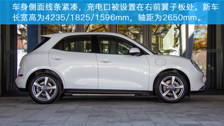 车身侧面的线条同样有着非常经典的设计元素,圆润的造型比例很协调,B柱进行了黑色的处理,充电口被设计到了右前翼子板处,在门板下方加入了黑色的防刮材质进行点缀。