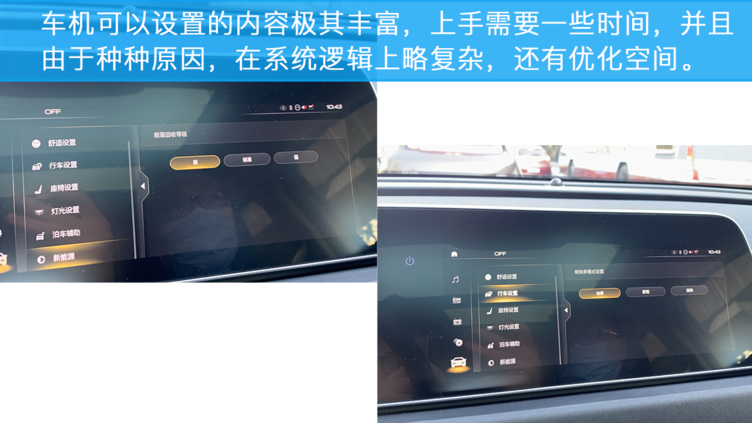 车机内部可设置的内容极其丰富,转向力度、能量回收等级、各种雷达的灵敏度等等,在驾驶前需要根据个人习惯进行调整,如果设置不当的话,可能会听到各种报警声。并且据厂家软件方面的工程师所说,诸如碰撞预警、车道偏离预警等程序的开关按照法律要求不能很简单的关闭,关闭按钮必须设置到2级菜单之后,并且即便关闭,在下一次启动时也会自动打开。所以我们也建议厂家可以增加驾驶设置的存储功能,可以一键读取之前存储的各项设置,这样可以极大的简化每次驾驶前的操作流程。