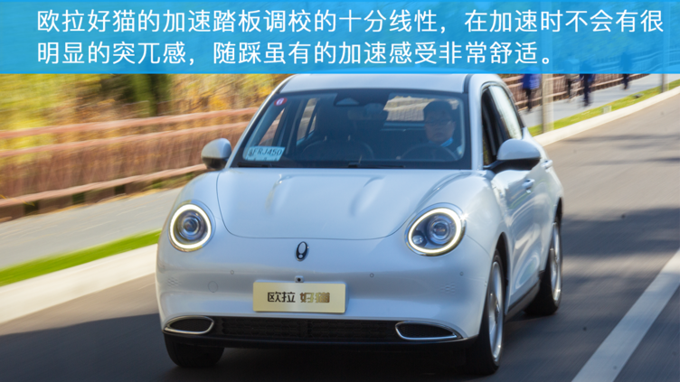 在动态驾驶部分,欧拉好猫的加速感受十分平顺,加速踏板线性,不会有任何突兀的感觉,随踩随有的动力输出非常的舒服,让你很想去继续驾驶它,搭配上手感细腻的方向盘,可以让你获得非常愉悦的驾驶感受。此外,转向回馈力度以及动能回收力度均可以通过车机进行调整,能够很好的满足不同驾驶员的驾驶习惯。