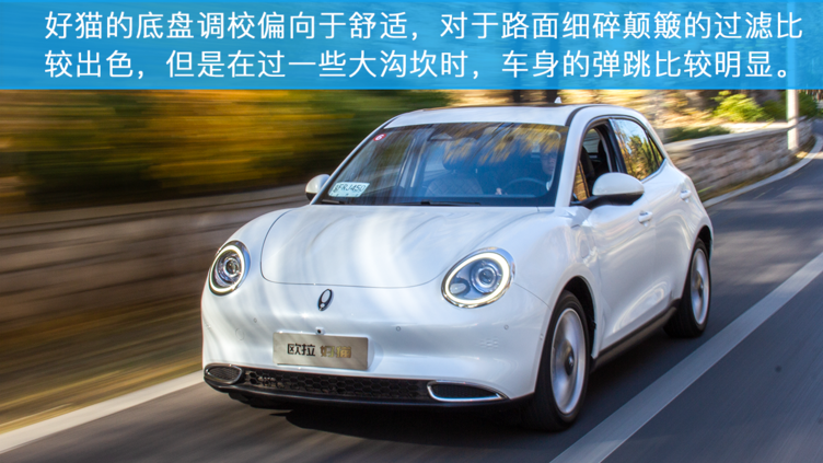 在底盘调校上,欧拉好猫的悬挂明显偏向于舒适,这种调校对于定位为城市型电动轿车的它而言无可厚非。对路面上细碎颠簸有着很好的过滤,一些来自于桥梁接缝或者是颗粒路面的颠簸都被很好的化解。但是在过一些大的减速带或者坑洼路面时,由于支撑性的原因,车厢弹跳的起伏会比较明显,行驶中的路感也不是很清晰。不过悬架的调校本就如此,无法做到面面俱到。