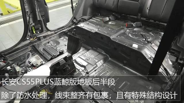以东风日产逍客的后排地板进行对比,你会发现长安CS55PLUS蓝鲸版先是线束的处理更齐整,这意味着更安全。同时,地板上除了刚才说到的防水覆盖之外,还有部分凹陷,形成类似加强筋结构,同时提升车辆的刚性以及整体安全性。