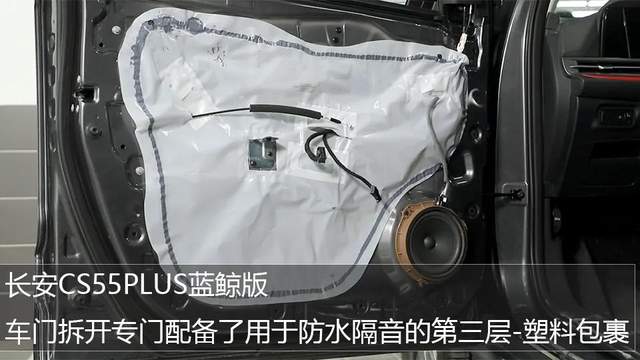 在刚刚拆开长安CS55PLUS蓝鲸版的门板时,最初能看到的是一个进行了塑料密封的包围件,它的作用除了小幅度的噪音隔离之外,还在于提升门板的密闭性,比如进一步的防水。