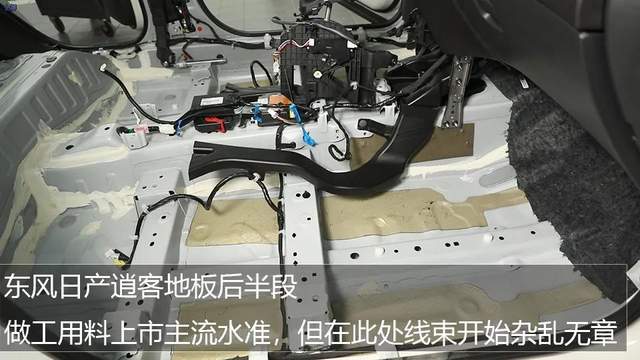 地板的后半段,从车辆B柱位置之后表现,东风日产逍客开始有了槽点。虽然做工、用料、设计都比较常规,但也还是主流水准,只是你会发现,线束的布局不再捆绑一体,从密封和包裹的角度,它都落了下乘。