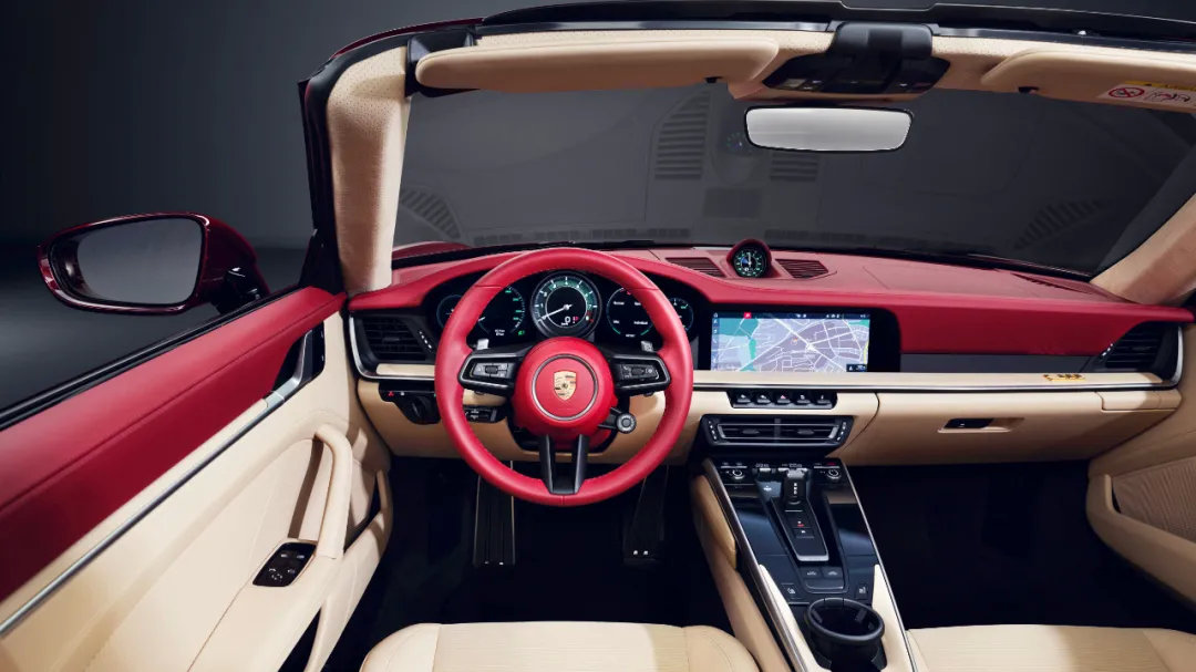内饰方面,992 Targa经典重现版共提供了两种内饰拼色可选,分别为红色+米色以及黑色+米色的设计。此外,座椅材质还使用了50-60年代十分流行的灯芯绒材质,在保留了出色触感的同时,也算是对那个年代的一种致敬。