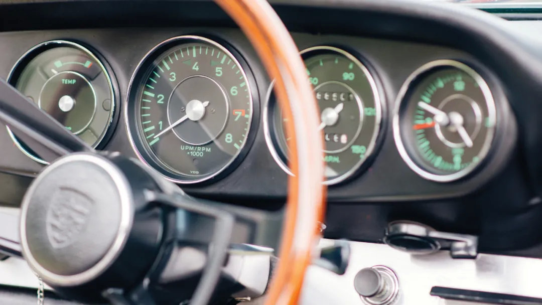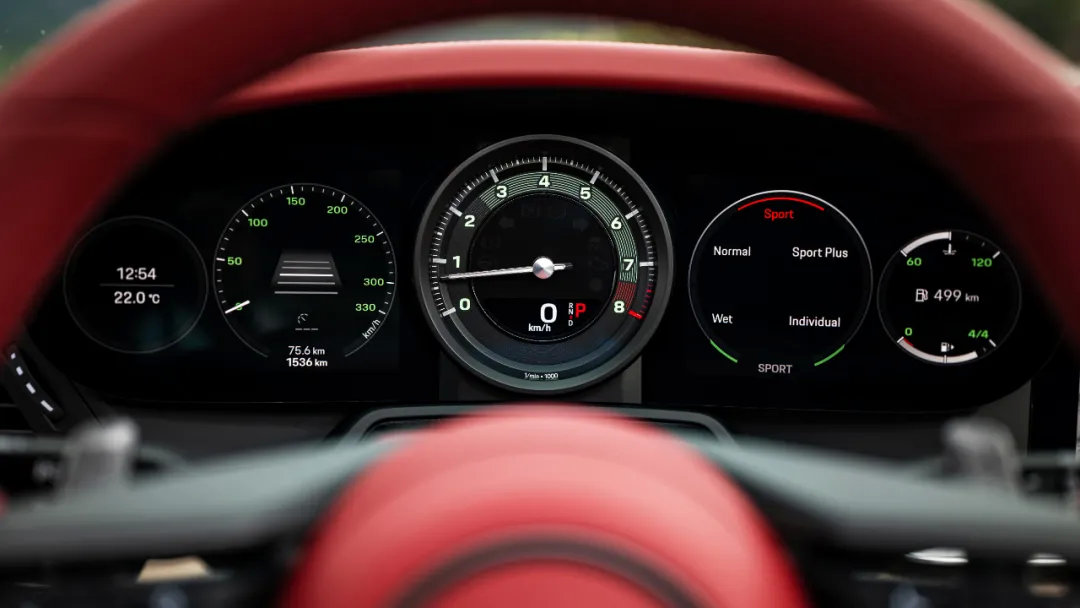 你能在仪表位置看到当年为了增加易读性所采用的黑底绿字五连表。以及992 Targa经典重现特别版为了提高转速表转动时速度感,所增加的线条底纹设计。