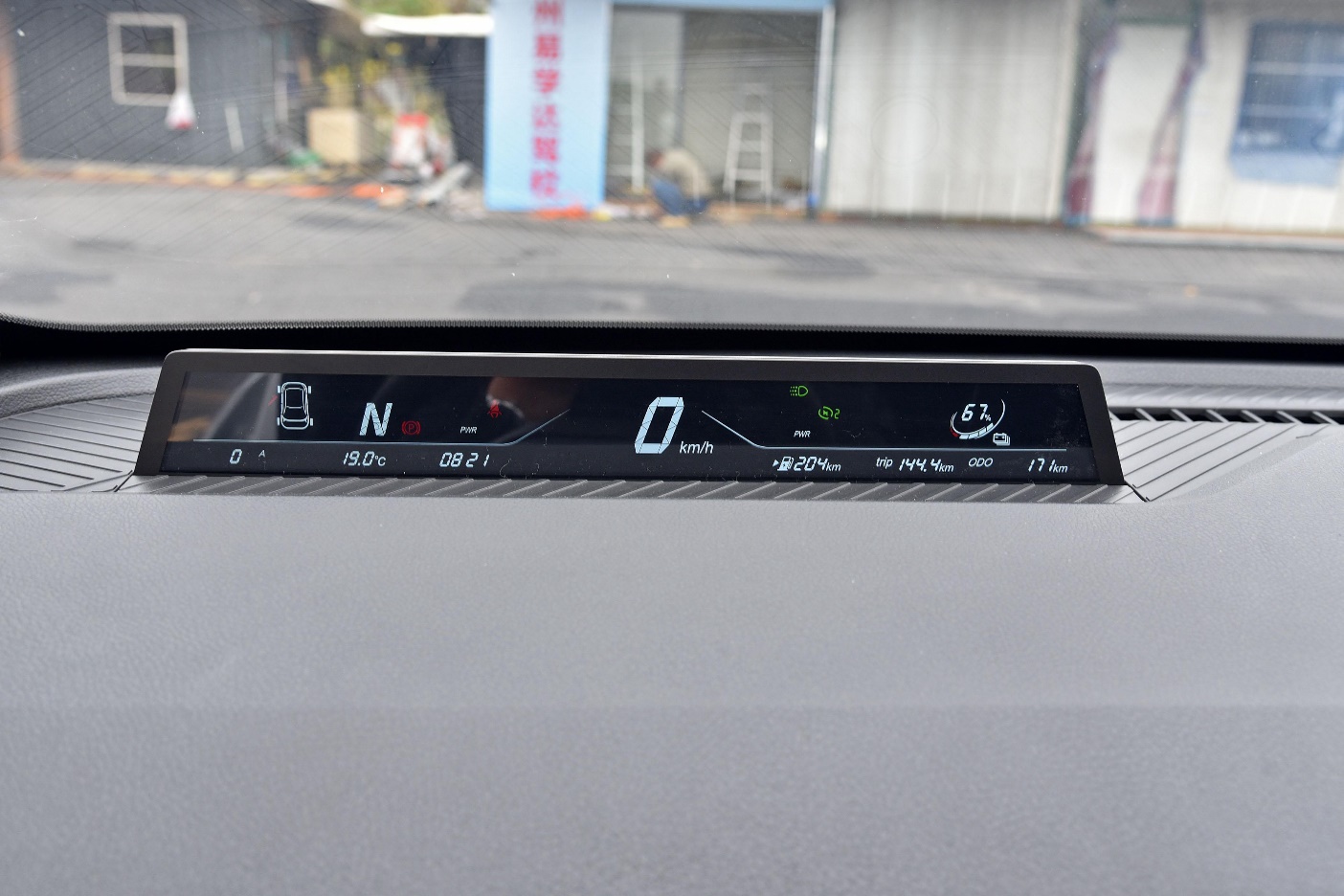 仪表盘并没有采用传统样式,而是将设计的更为细长的仪表盘放在了中控台最前方,有点类似抬头显示的位置。虽然没有采用液晶屏,但是这块仪表盘的信息显示也比较全面。