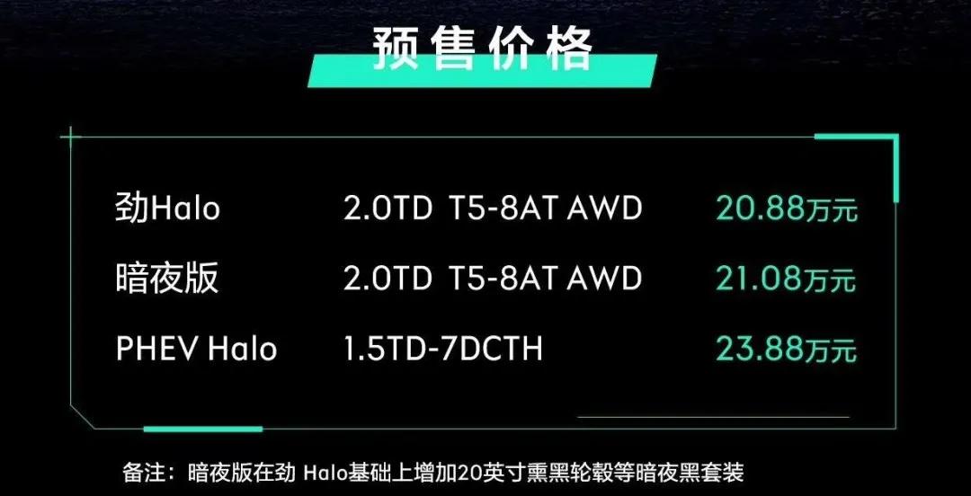 此前新款01已经公布了部分车型的预售价,搭载T5动力+四驱系统的劲Halo预售价为20.88万,比起现款的四驱劲Pro版贵了1万。虽然这只是预售价,并非最终售价,但新款01很有可能会“涨价”。