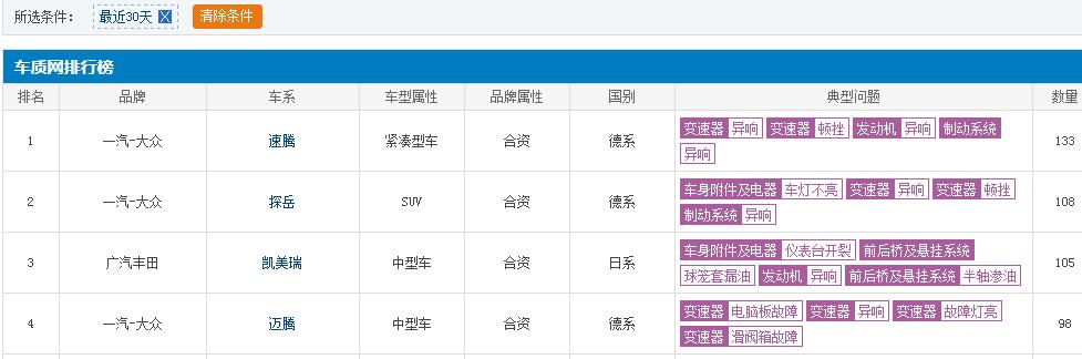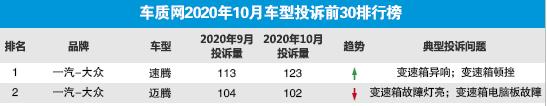 但是,在上个月的投诉榜单中,一汽大众速腾却在意料之中的"荣获"第一,为什么说速腾位居榜首是在意料之中呢?因为从今年的8月份开始,速腾的投诉量就在呈上升趋势,作为一汽大众旗下的畅销车型,10月份速腾和迈腾 (配置|询价)居然巧合的位列榜单前二位,其中,速腾的典型问题为:变速箱异响,变速箱顿挫。