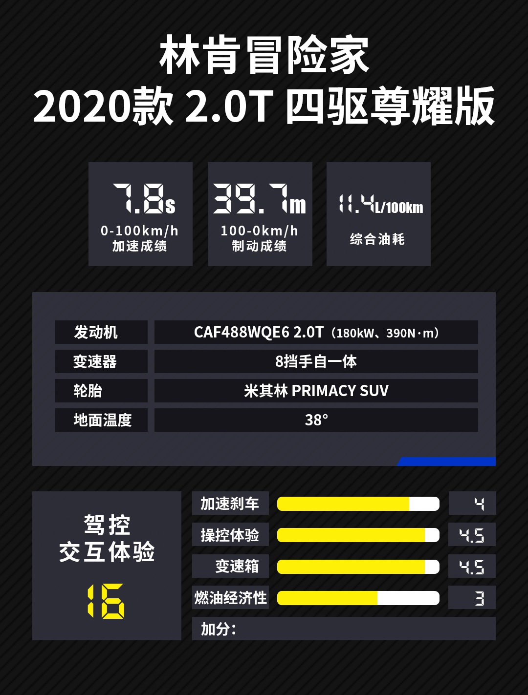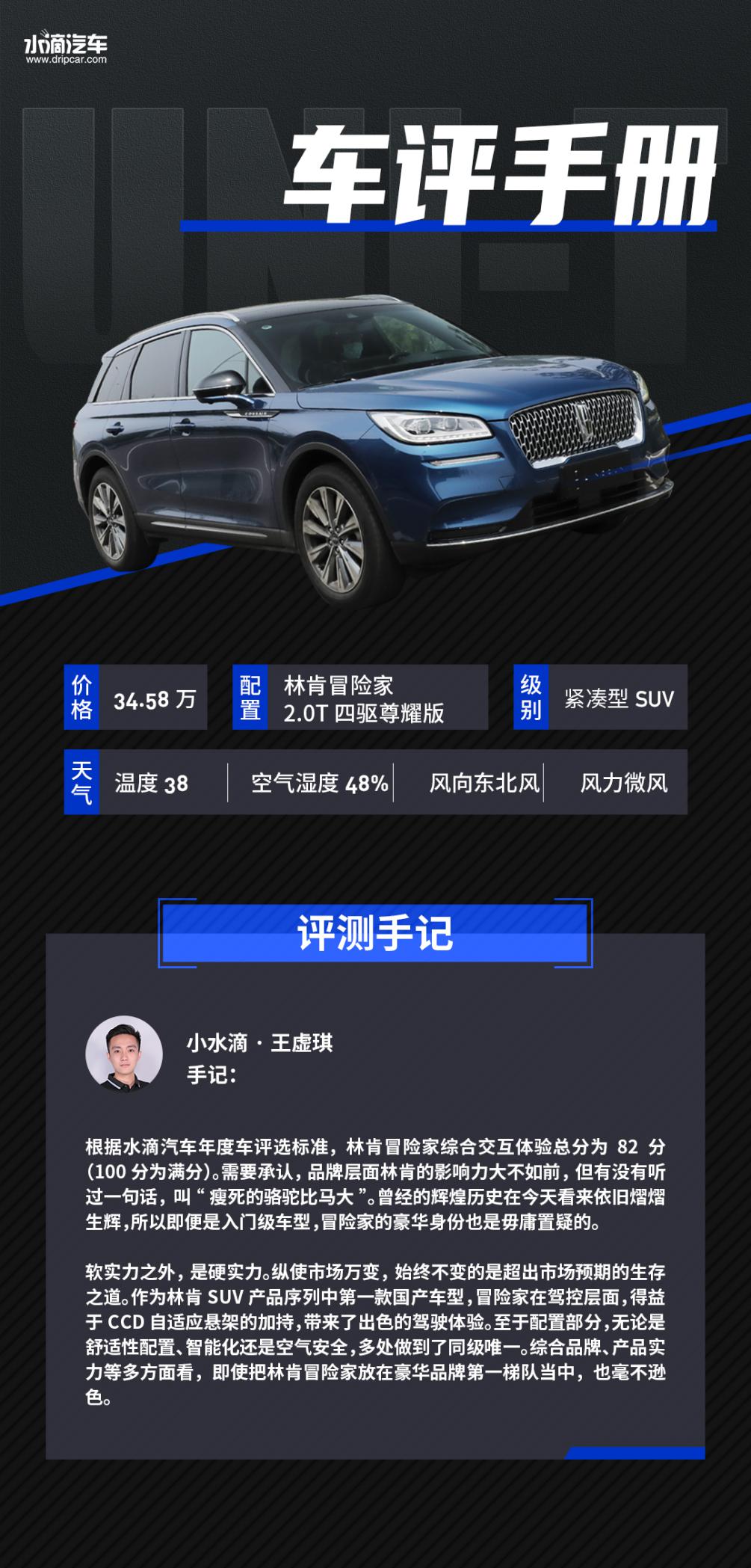 虽定位为紧凑型SUV,但林肯冒险家的视觉效果却迥然不同。标志性的大面积镀铬格栅,配以舒展的线条,饱满的形面造型突破了尺寸的限制,给人以更稳重的视觉效果。多辐式轮毂造型、悬浮式车顶、贯穿式尾灯则在烘托视觉体量感的同时来增添年轻感,将两者进行结合,来迎合挑剔的Z世代消费者。通过种种细节的雕刻,林肯再次让人们感受到了美系车的豪华,找回对车应有的期待。在新车上市一段时间后,水滴汽车根据用户调研数据显示,消费者重点关注其驾控乐趣、车内空间以及智能化水平等。基于以上关注点,水滴汽车针对林肯冒险家(2020款 2.0T 四驱尊耀版)展开了相应测试。