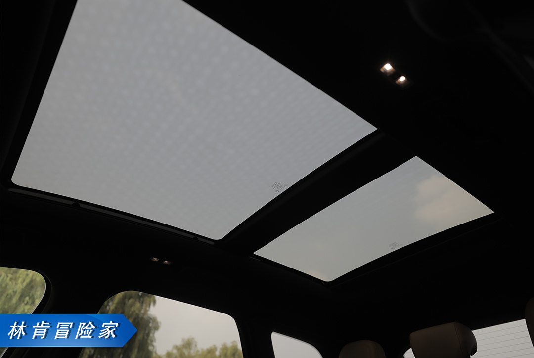 天窗能大幅度提升车内乘员的通透感,缓解车内封闭空间的压抑。林肯冒险家出最低配车型均带有全景天窗,采光面积约为0.86㎡,可开启面积约为0.23㎡,面积可观。