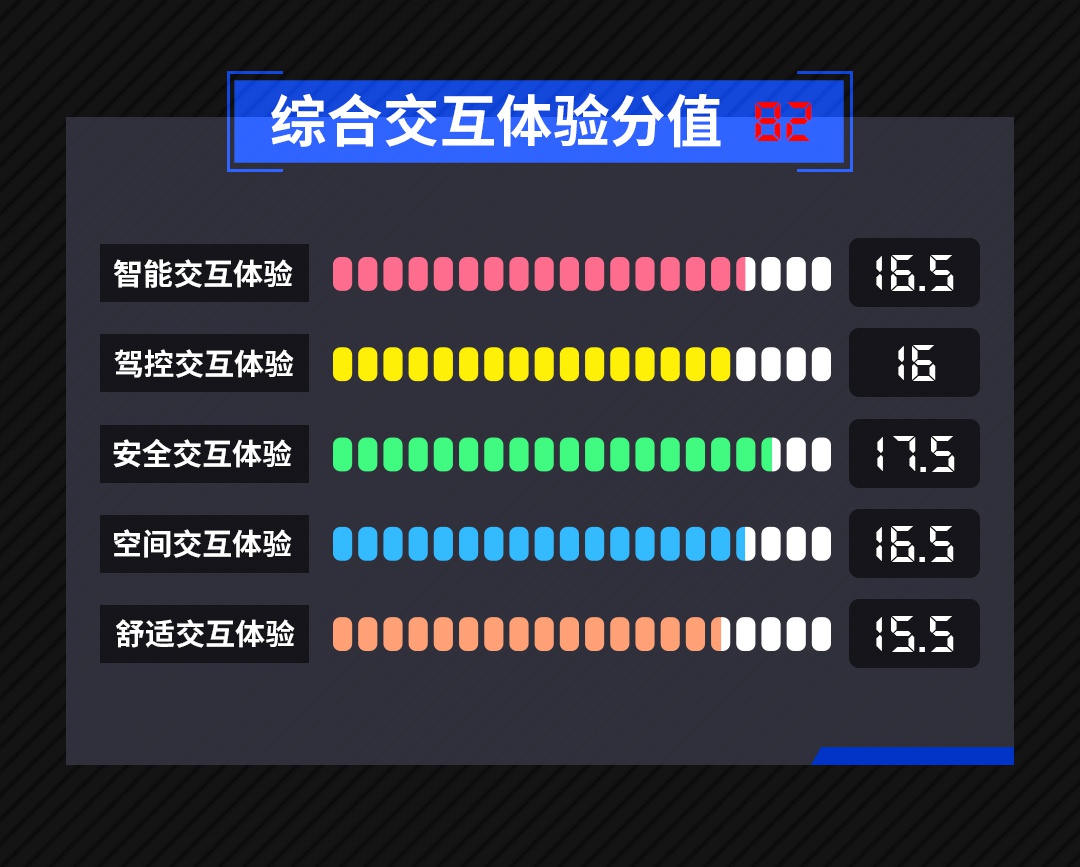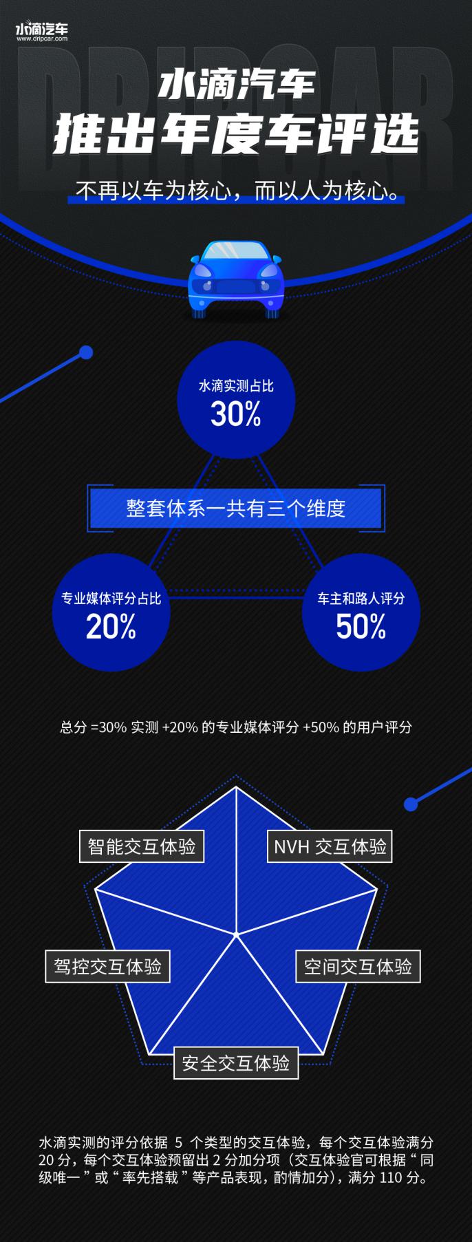 注:水滴汽车实测体系(DH-110)满分为100分,根据5大不同交互体验维度,每个维度预留出2分加分项。交互体验官可根据"同级唯一"或"率先搭载"等产品表现,酌情加分。